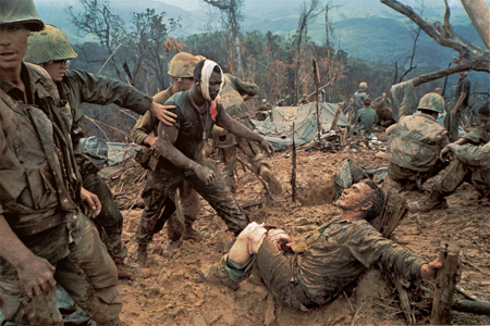Left: After a fierce firefight on Mutter's Ridge in October 1966, Marine Gunnery Sergeant Jeremiah Purdie reaches out to try to help his captain, Capt. James J. Carroll, who lies mortally wounded.