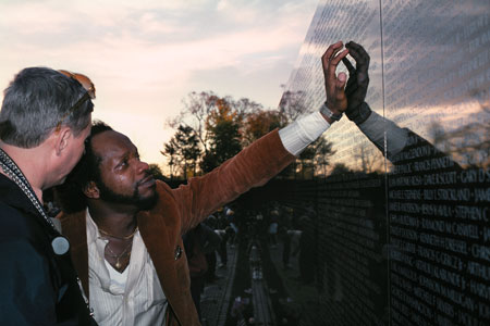 Right: Purdie is pictured at the Vietnam Veterans Memorial dedication ceremony in Washington, DC in November 1982. He’s reaching up to touch the name of Captain Carroll inscribed on the Wall.